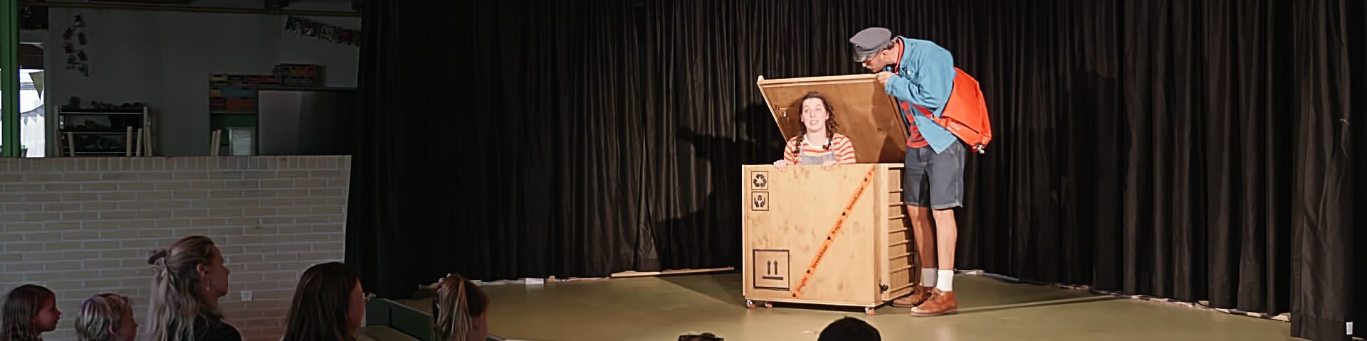 ‘Ik ben Jasmijn en ik ben een postreiziger!’ Dat was even schrikken toen er ineens iemand omhoog sprong uit de grote kist op het podium. Postbode Anne Thijs dacht even rustig een kopje koffie te kunnen drinken, maar de kinderen zagen het al aankomen: een grote gele periscoop kwam omhoog uit de kist en even later vloog het deksel eraf. Jasmijn was vanuit Amerika bezorgd op de Jenaplan Vlinderbos school in Wilnis. Wat volgde was een vrolijk optreden waar de kinderen enorm van genoten. En Jasmijn bleek van alles in haar kist bij zich te hebben. Van een stofzuiger tot en met een wasmachine. Maar tenslotte besluit ze toch terug te gaan naar huis.